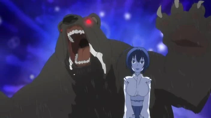 She develops a inner visage in the form of a ferocious bear that appears behind her whenever she is jealous or angry. The reason given is because she is Miya's disciple. Partly thanks to the inner visage, she has earned the nickname bear (Kuma) given by Tsukiumi,[1] by Benitsubasa (during the third stage after witnessing her visage)[2] and by the fact of this visage being obviously a bear. While Miya uses the Demonic Visage, Musubi uses the "Bear Visage". Another reference of it is when she and Tsukiumi protect both Minato and Kagari after the kiss.